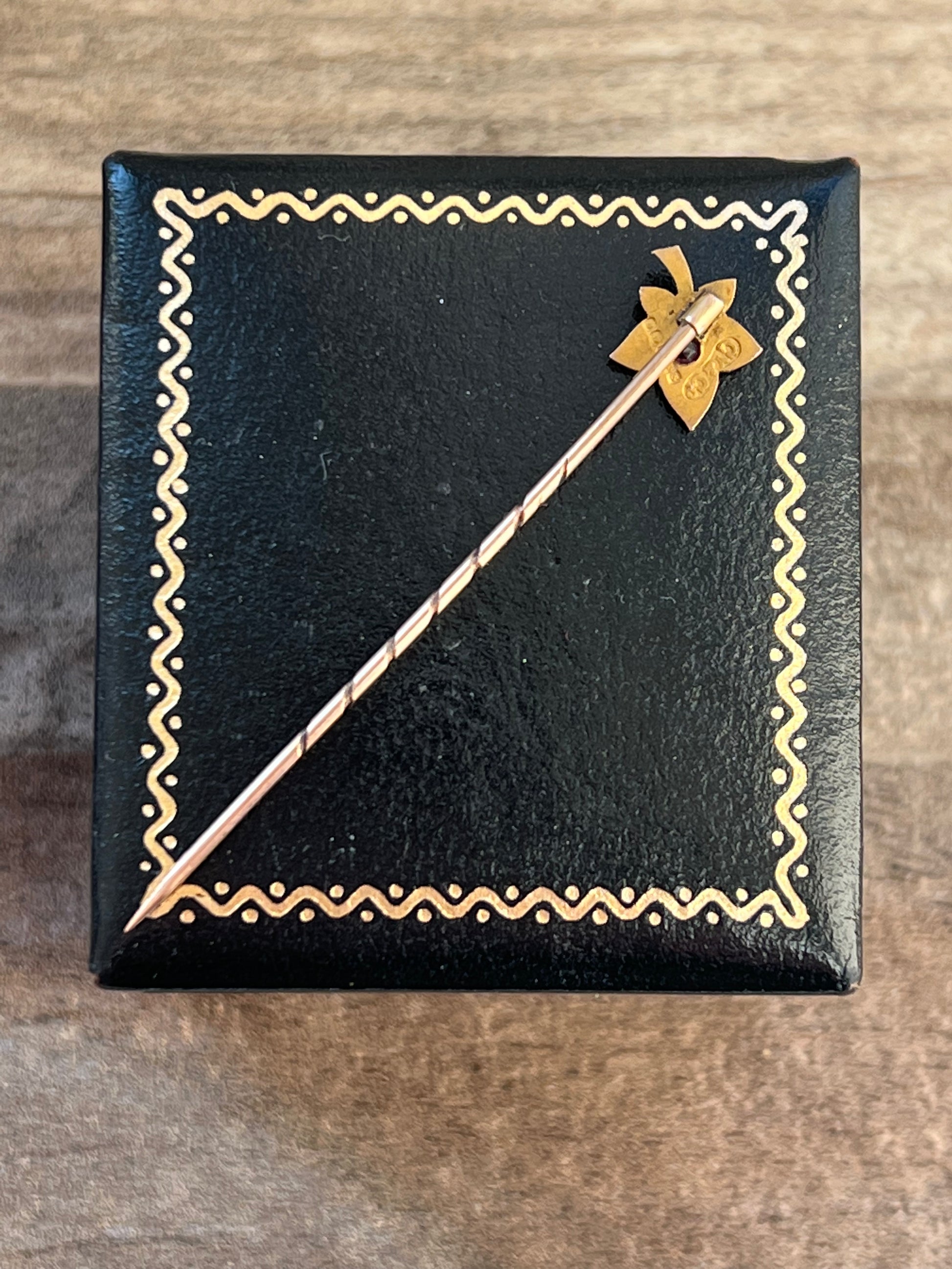 A lovely antique gold stickpin modelled as a leaf with a ruby coloured stone to the centre, surrounded by pearls. In very good condition with light signs of wear commensurate with age and use. Fully hallmarked for 9ct gold on the reverse of the leaf
