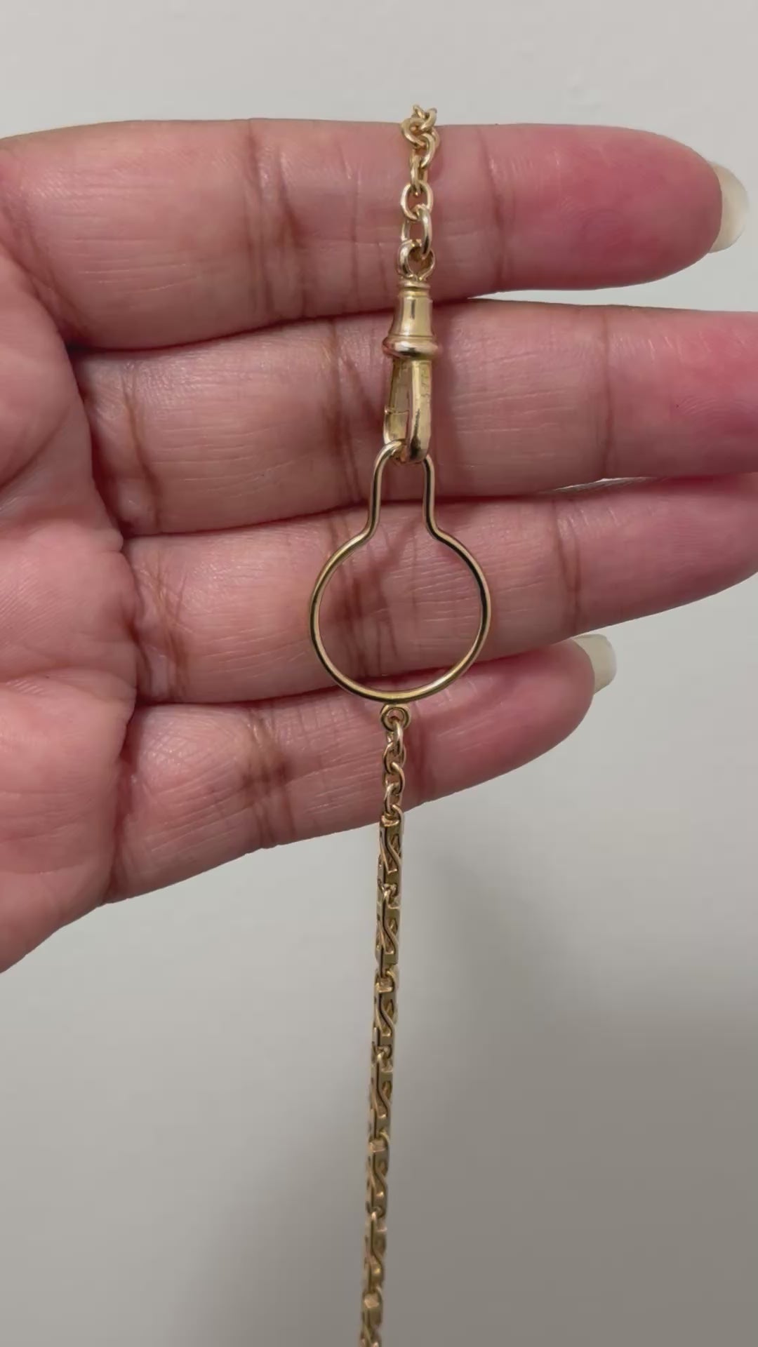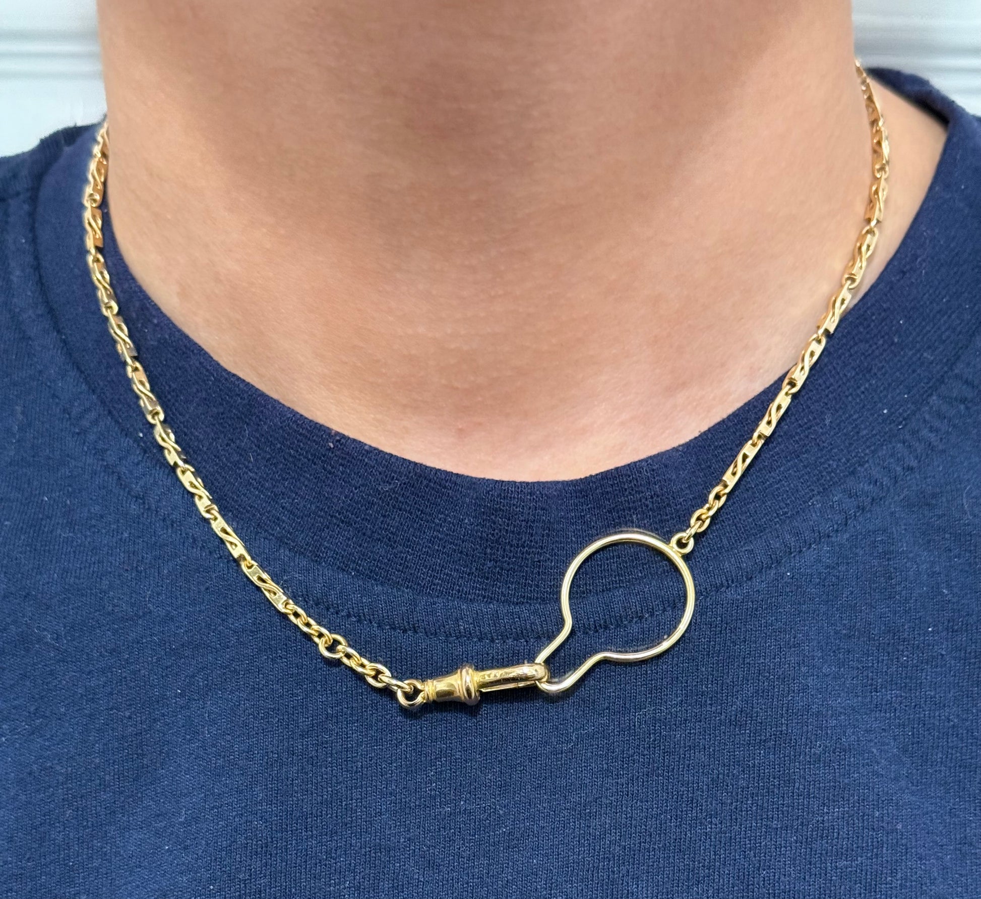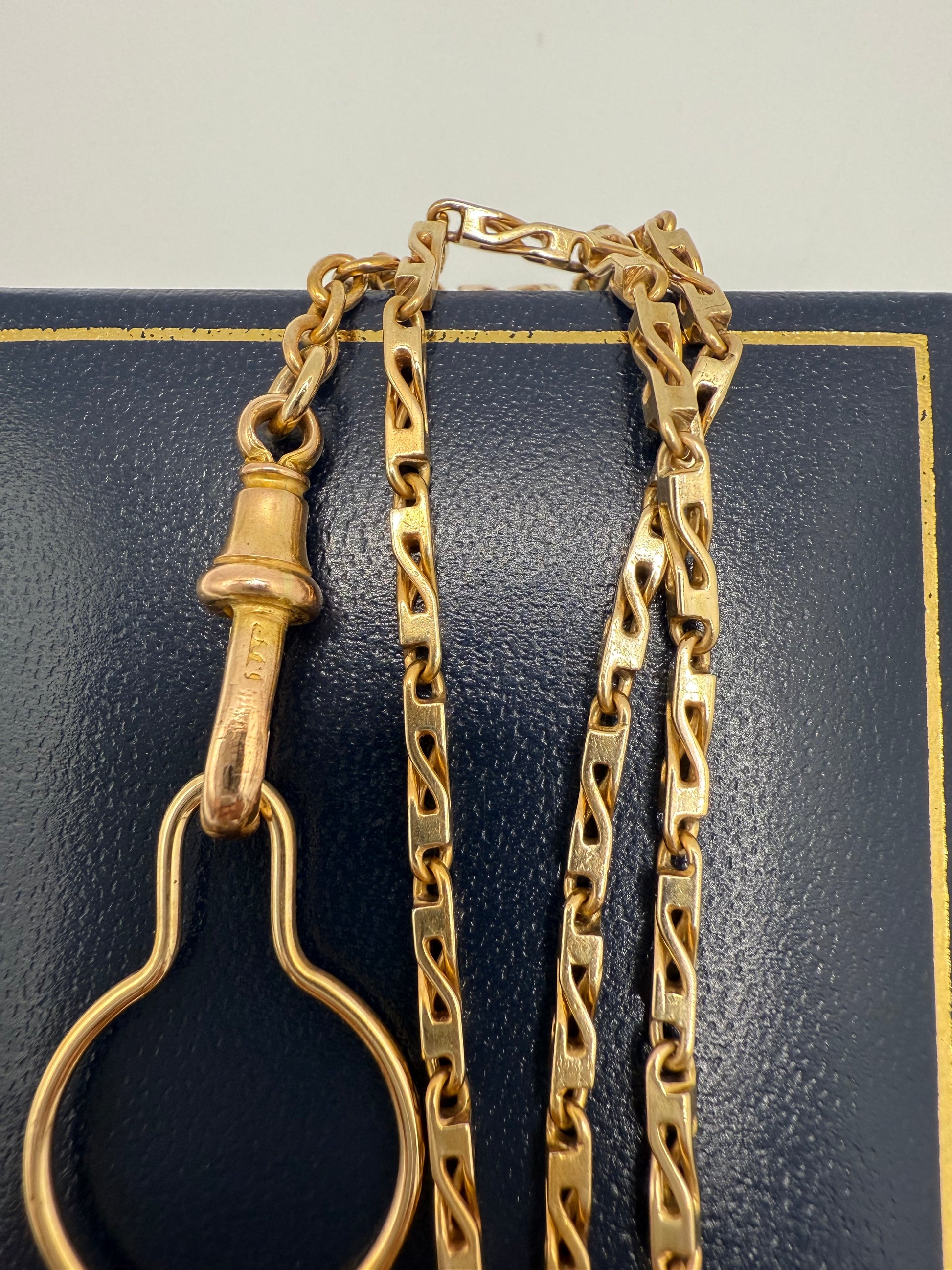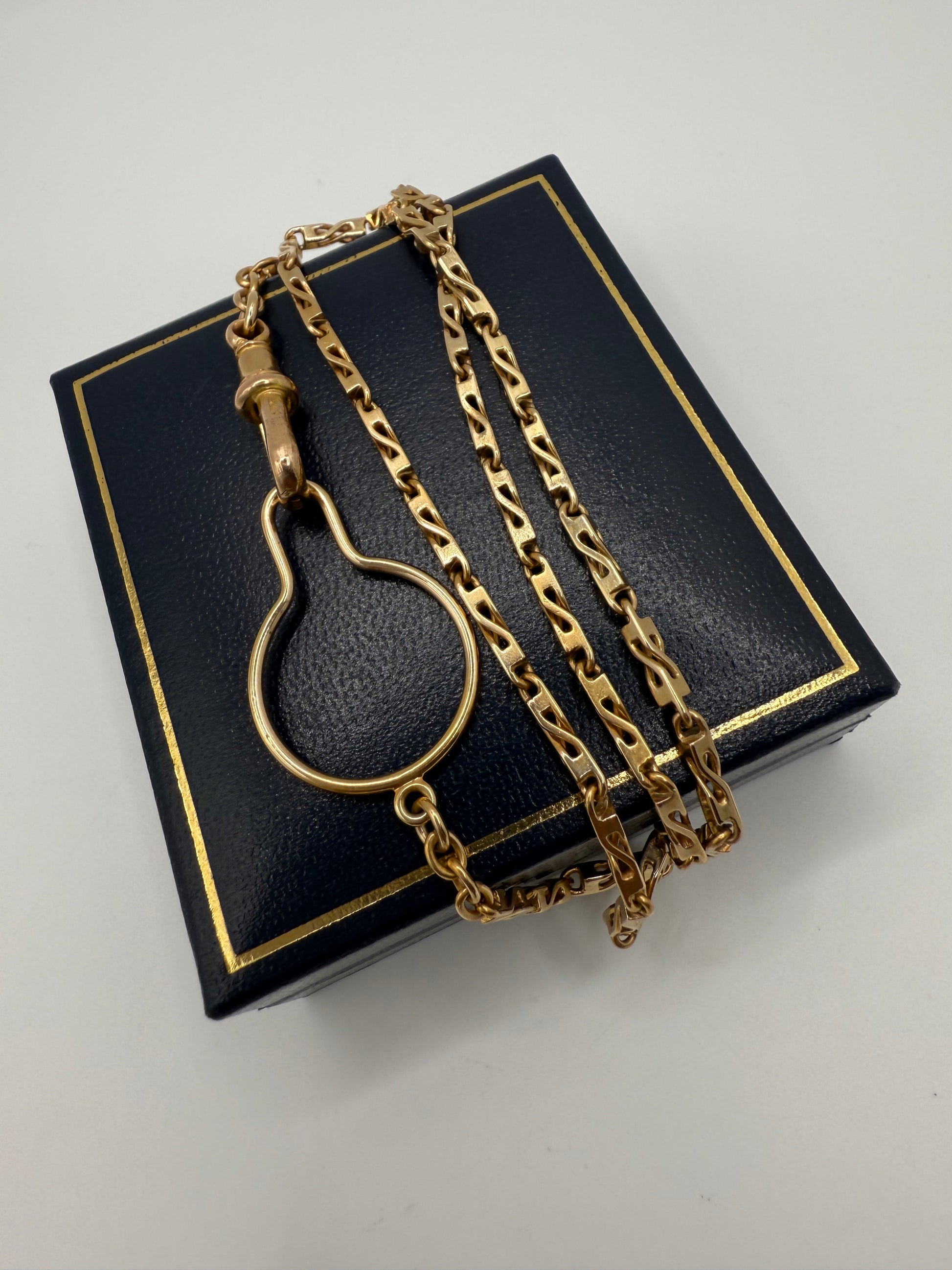 A gorgeous vintage gold open work bar link chain complete with a dog clip and button hook combination to close. A great one and done chain but one that would also work nicely in a neck stack. The chain has a rich warm yellow tone. In very good condition with light signs of wear commensurate with age and use. Stamped for 9ct on the dog clip. XRF tested to confirm purity of 9ct gold.